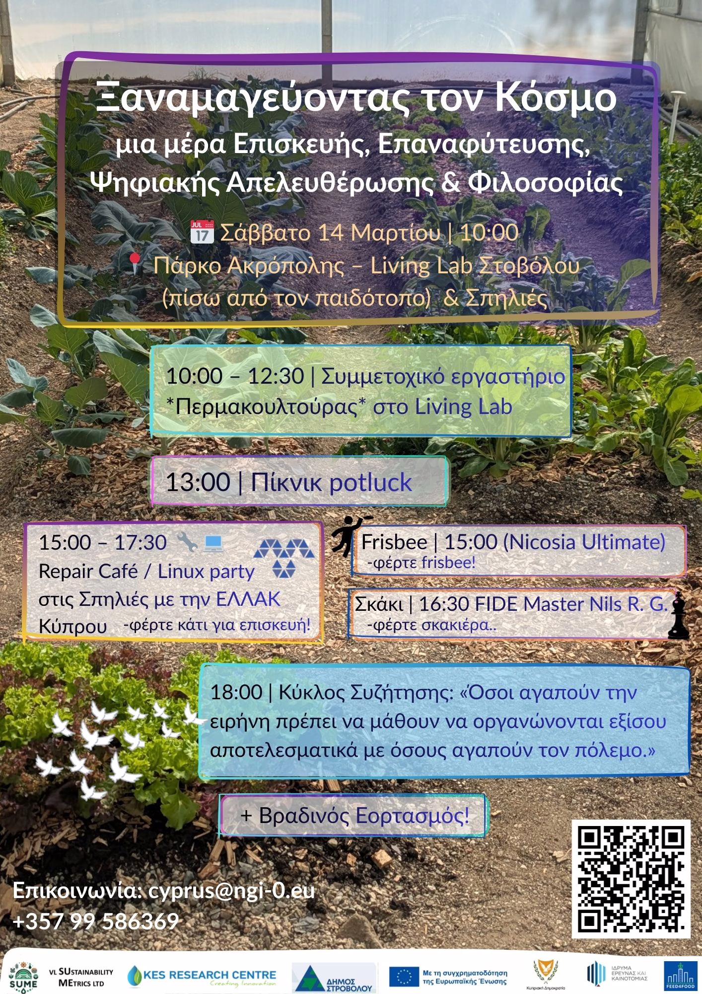 Αν θα θέλατε να: φιλοξενήσετε ένα παιδικό τραπέζι επισκευής, προσφέρετε μια σύντομη ομιλία 5-10 λεπτών, συντονίσετε ένα παιχνίδι, φέρετε εργαλεία, βοηθήσετε στον συντονισμό του φαγητού, τεκμηριώσετε τη μέρα, κρατήσετε χώρο στη συζήτηση, ή προτείνετε κάτι που δεν έχουμε ακόμη φανταστεί, επικοινωνήστε: cyprus@ngi-0.eu / +35799586369